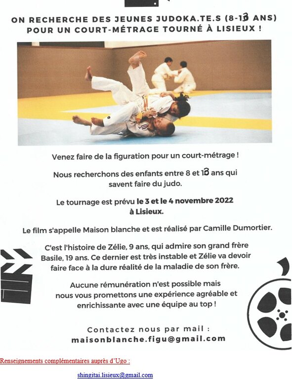 Après un an de montage et de post-production, le film de Camille Dumortier, MAISON BLANCHE, est désormais terminé. Les jeunes judokas qui ont participé à titre de figurant au tournage de ce film sont donc invités à une projection publique le :